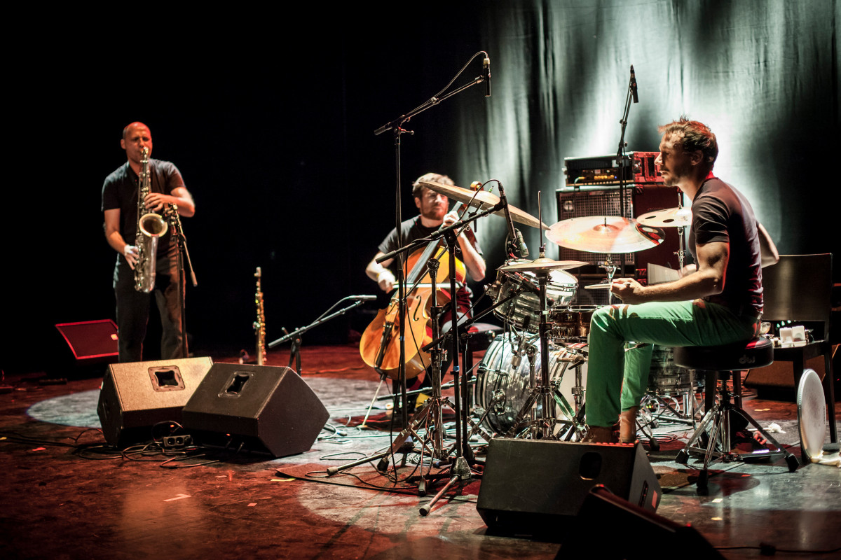The energetic potential of instrumentation is used to its fullest: from a minimalist and noisy friction of the bow to a sound typhoon, the trio explores these extreme fields with the same eagerness. The new tones created by the sound objects of Sylvain Darrifourcq resonate perfectly with the creative cello of Valentin Ceccaldi: melodic, harmonic and percussive, all at once. Manuel Hermia exerts a powerful lyricism to this mechanical thread reaching a cathartic outburst.